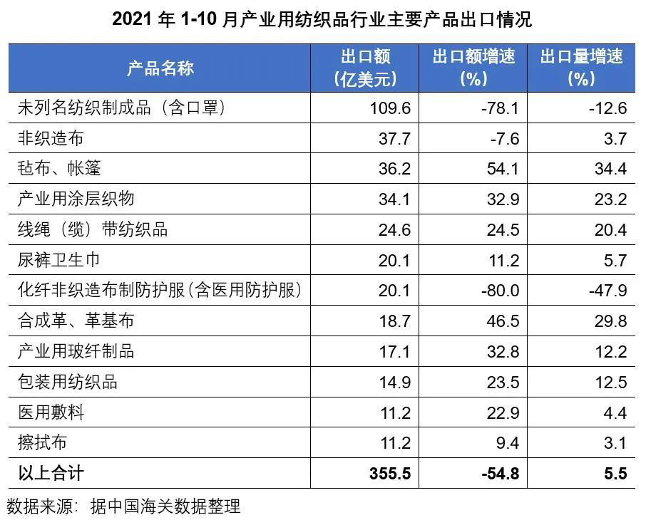 当前,由于变异新冠病毒持续扩散,多国被迫再次采取紧急封 锁措施,从而加大全球经济复苏的不确定性。我国产业用纺织品行业在国内散发疫情、洪涝灾害和限产限电等因素叠加冲击下,特别是受2020年同期高基数效应的影响,2021年1-10月行业规模以上企业的工业增加值持续下滑,降幅为20.4%,但两年平均增速仍达12.4%。